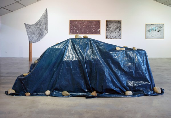 Installation de blocs sous bâches et roches d'Ensisheim - Dimensions : 280 x 140 cm